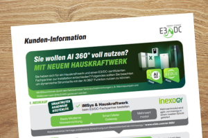 Mit E3/DC entscheiden Sie sich für ein zukunftssicheres System, das auf Stundenbasis abrechnen und steuerbare Verbraucher wie Wallboxen oder Wärmepumpen vollständig integrieren kann – gesetzeskonform und flexibel. Dank unserer Partnerschaft mit inexogy erhalten Sie faire Konditionen beim Messstellenbetrieb statt überteuerter Angebote. Und mit dem E3/DC-Ersparnis-Rechner können Sie jederzeit transparent kalkulieren, wie viel Sie mit AI 360° tatsächlich sparen.